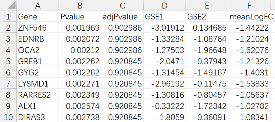 colnames(out) <- c("Gene", "Pvalue", "adjPvalue", "meanLogFC")