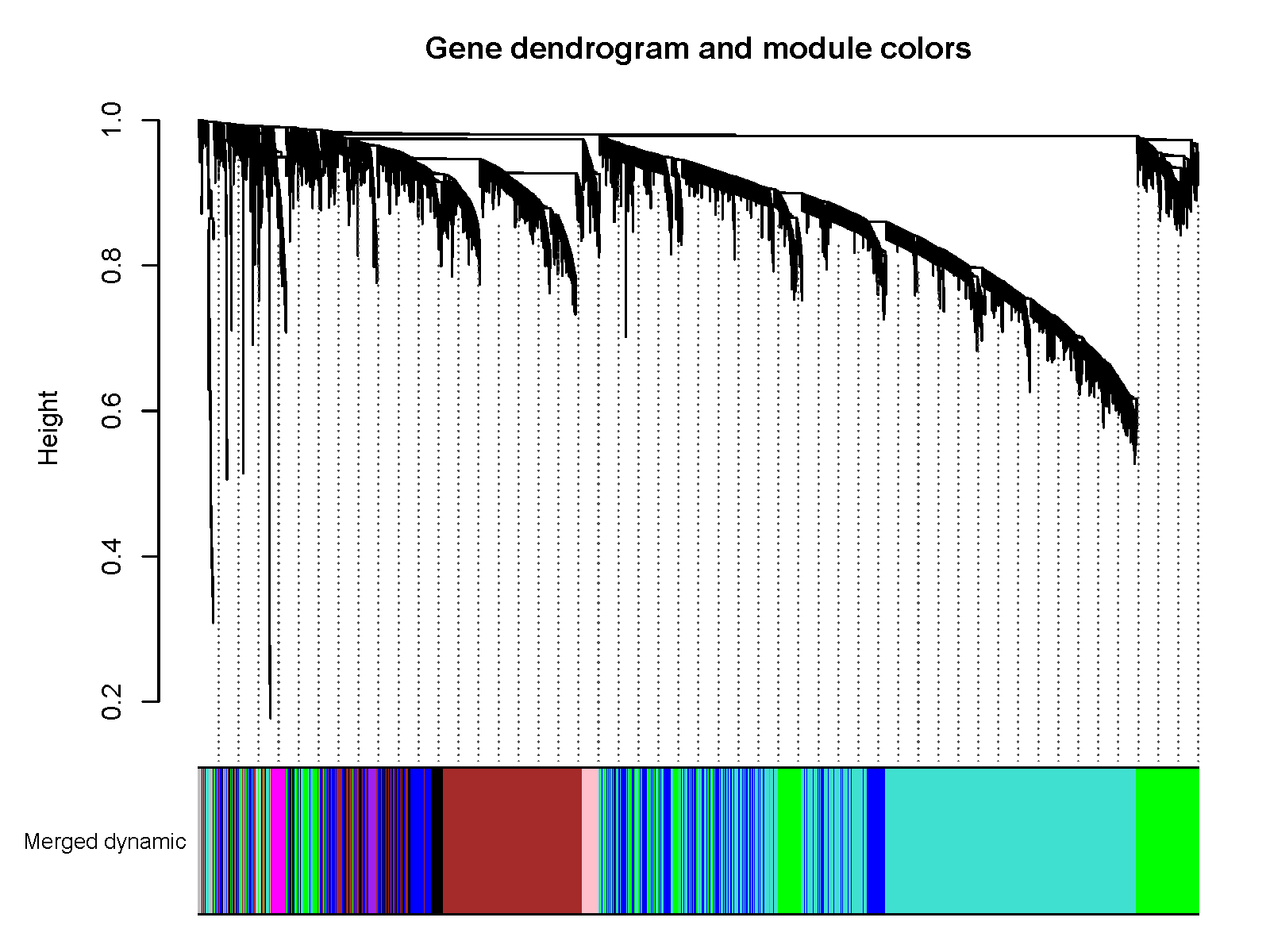plotDendroAndColors(geneTree, mergedColors, "Merged dynamic",