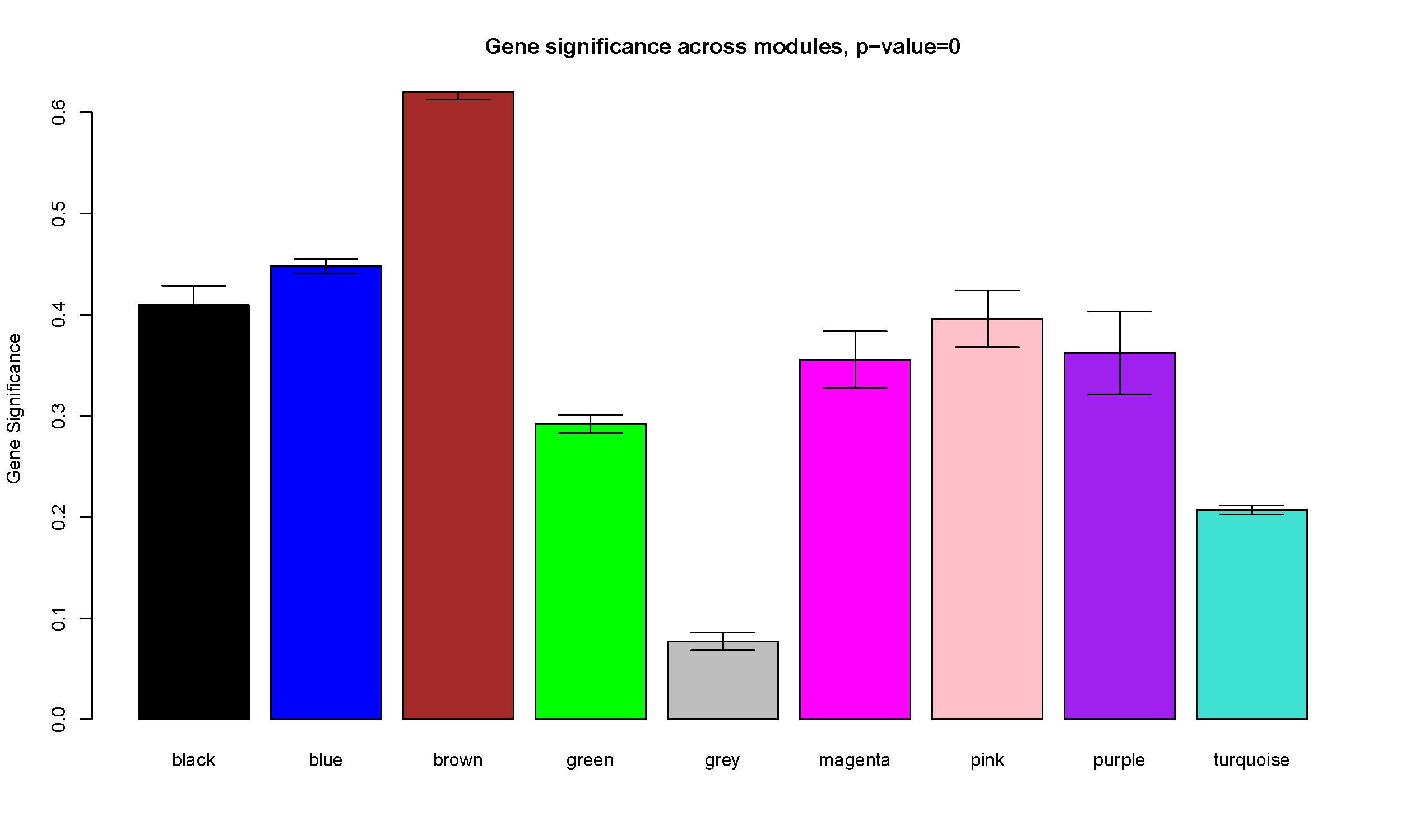 ModuleSignificance=tapply(GeneSignificance, mergedColors, mean, na.rm=T)