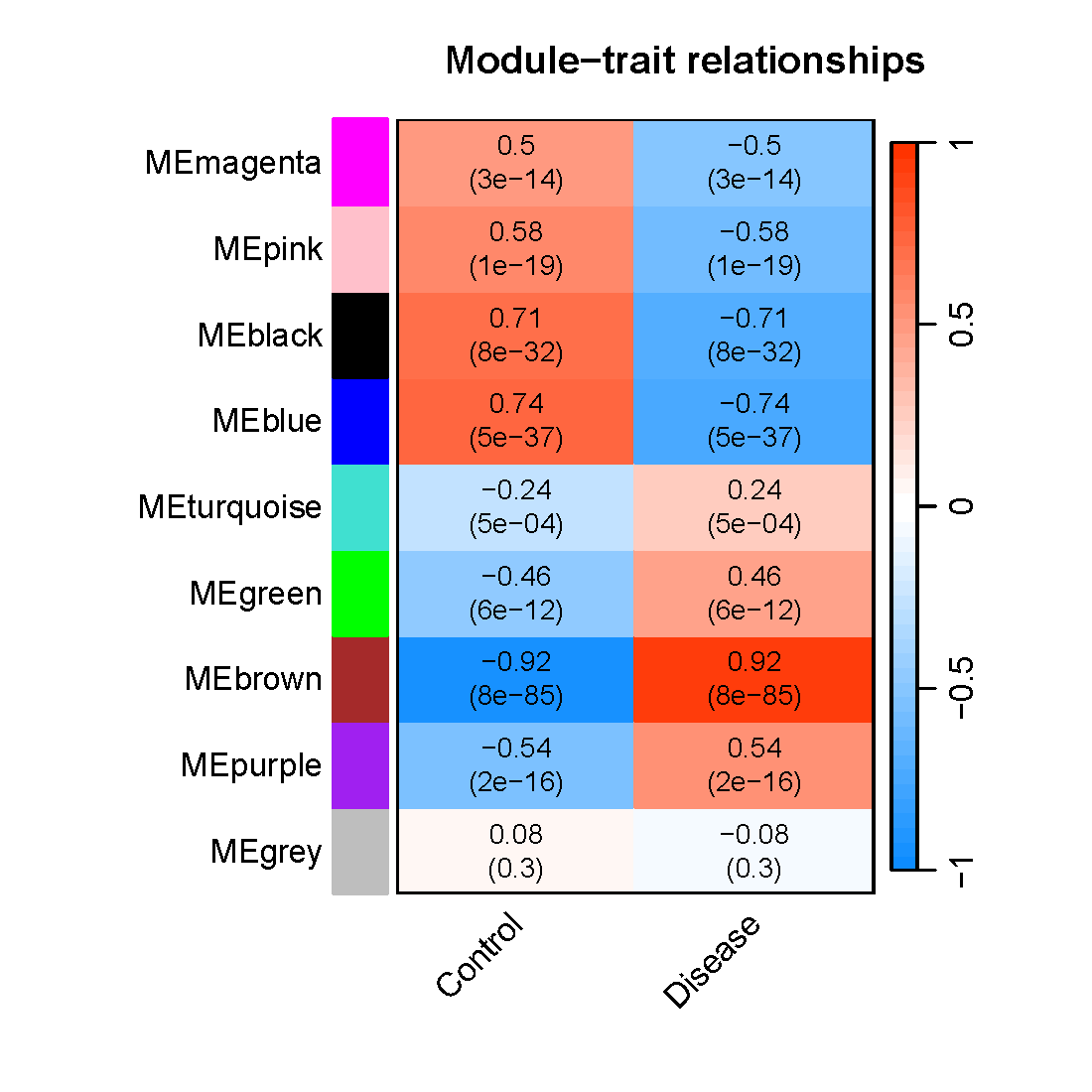 moduleTraitPvalue = corPvalueStudent(moduleTraitCor, nSamples)